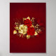 The composition of two artistically painted red roses and one golden rose, decorated with gold, jewel leaves on textured background.