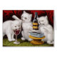 This picture is so cute. There are three white kittens and they have a bottle of wine with a glass. There also are sardines. They probably like those. It is just too cute for words. There is a red shiny background to set it all off. It is in public domain.