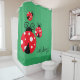 Three Ladybugs (White Spots) Design Shower Curtain with customisable background colour and text. For no text, delete sample text and leave blank.