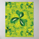 Three leaf clovers pattern poster with an abstract vector illustration of clovers in fresh yellow and green colours and many decorative elements around them. Though, contrary from their four-leaf siblings, these fun flowers are not considered lucky, they are as pretty and beautiful as every botanical part of nature that flourishes in the spring season.
