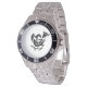 Has heft and feel of expensive stainless steel quartz watches. Good band with safety catch. I removed links, which is easy because engraved arrows show direction to push the linking pins. As always by this seller, the image (a railroad logo) is a perfect reproduction of my emailed image, and is precisely spaced and aligned.