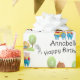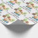 This custom kid's gift wrapping paper features a colourful children's folk and fairy tale theme. The three little pigs from the classic fairytale are pictured standing near their huts of straw, sticks, and bricks. The Big Bad Wolf is seen creeping in the distance. A sample Happy Birthday message is printed above the illustration, and a sample name is printed below in a whimsical black font. You can personalise the gift wrap to include your own custom name or text.