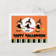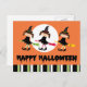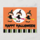 A cute and fun design to wish family and friends a Happy Halloween featuring three cute witches flying on broomsticks in front of a bright full moon and an orange coloured sky with an eye-catching green, black and white striped trim at the bottom of the postcard. The postcard has "Happy Halloween" written in blood curdling letters with blood dripping at the bottom of each letter. If you would like different text, please contact us through the CelebrationBazaar store and we would be happy to create it for you. Please visit the CelebrationBazaar store to see the collection of stationery, mementos and party favours featuring this cute Halloween design.