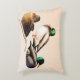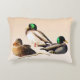 This accent pillow features an artistic rendering of three Mallard Ducks perched on a pale orange gradient background. The male ducks can be identified by their iridescent green heads and yellow beaks. The females have lovely feathers in shades of brown and gold with orange beaks. The image is repeated on the back.