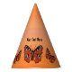 This paper party hat is done in shades of vibrant orange with three brown monarch butterflies with pretty markings on their wings. Customise your text with the template.