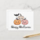 Step into the enchanting world of Halloween with our delightful Halloween postcard! Embrace the spirit of the season with its charming design featuring three cartoon pumpkins or jack-o'-lanterns in orange, pink, and off-white, along with a cute black bat. Against a crisp white background, this postcard captures the essence of Halloween fun.