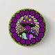 A button with three green and purple mushrooms against a lighter green and purple swirl background. The design is surrounded by dark purple floral motifs.