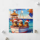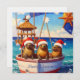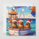Three seals wearing santa hats sailing on the sea