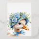 the story of a joyful milestone— very first birthday, a celebration wrapped in love, warmth, and a touch of whimsy. The design centres around a charming goose, lovingly illustrated as if plucked from the pages of a beloved children’s book. He’s not just any goose—He’s “one silly goose,” dressed for a party in a striped hat and floral crown, proudly clutching a Blue balloon. His expression is wide-eyed, innocent, and full of personality—just like a one-year-old discovering the world.