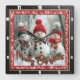 This appealing square wall clock showcases a festive winter illustration of three snowmen standing in a soft, snowy forest setting. The snowmen are adorned with colorful red and green knitted hats and scarves. Bold, decorative script reading "Merry Christmas" anchors the bottom of the image. The inner illustration is surrounded by a vibrant, textured red border that evokes the look of shattered or cracked ice. This entire decorative print is housed within a wide, dark outer wood-look frame, which is simulated using high-detail artwork and is not real wood.