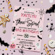 These fun and stylish invitations are perfect for anyone celebrating a 3rd birthday this Halloween. The design features everything spooky from a black cat with flying bats to a spider's cobweb, ghosts, a witches broomstick, skull & bone, magic glass ball and a jack-o-lantern pumpkin all in black, white and shades of pink colours. The template wording is easy to personalise and your party guests will be in for a scare when they receive these invites in the mail!