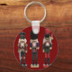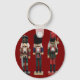 This double sided button keychain, zip pull, features three traditional Nutcrackers, one with a pair of cymbals, one with an axe and one with a sword against a white background. perfect as a gift or stocking filler.