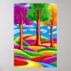 Three trees with different colour leaves on a colourful field with a blue sky and white clouds, vibrant colours,