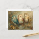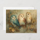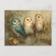 A trio of owls; one teal, one rust, and one golden, perch gracefully on a leafy branch in this softly textured, painterly design.