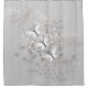 Fashionable shower curtain with my pretty vector design of three white and black butterflies flying over airy bubbles of grey and white with touches of peach, on a grey background.