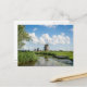 Postcard of three windmills along a canal with boats and reeds under a blue sky with puffy clouds creating a peaceful scene in the dutch countryside of Leidschendam, the Netherlands.