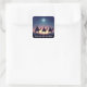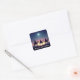 Silhouetted against a starry night sky are three wise men journeying towards a bright star.