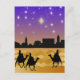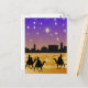 The three wise men approaching Bethlehem with the star blazing in the sky.