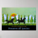 Second version, this one has the silhouette of a rider with the first horse. "Run with us through the wild" the first line reads. "Preserve All Species" the second line reads. Choose your size or customise this colourful poster with your own text! The silhouettes of two horses galloping through a green meadow, with pine trees, mountains and a sunset / sunrise. Textural background. From a mixed media art illustration by Minerva Bloom for Angela Piraino: www.angelapiraino.weebly.com