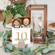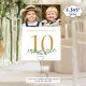 Include various photos of the bride and groom through the years for an entertaining table sign for the wedding guests. Fun to have similar age photos on the same sign and different photos on each table as guests mingle. Printed identically on both sides for two-sided viewing. The yellow gold text colour can be changed to coordinate with your colour scheme and the greenery can be deleted if not desired.