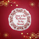 Beautiful round throw pillow with red ornate floral border, displayed with the saying, "Jesus is the Reason for the Season!" This throw pillow will be a stunning display for your home during the Christmas holiday!
