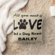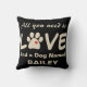 Cute throw pillow with dog paw with heart in it and saying, All You Need is Love and a Dog Named Bailey. You can customise it with your own dog's name as the name is a template object. Reverse side of pillow has same saying is opposite colour combination. Great for you or for a dog lover you know.