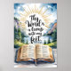 A watercolor illustration of an open Bible with the text "Thy Word is a Lamp Unto My Feet." Golden rays are shining outward from the Bible. The background is a serene landscape with mountains, trees, and a body of water.