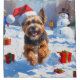 A lively Tibetan Terrier runs joyfully through the snowy winter scene, wearing a festive red Christmas hat. This charming design highlights the breed’s long flowing coat, playful personality, and affectionate nature while capturing the warmth and joy of the holiday season. A delightful winter moment full of festive cheer.
