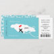 A fun but stylish wedding invitation in a boarding pass/ticket style for couples getting married abroad in Jamaica which is shown in a white map silhouette on teal blue with sweet red love hearts, aeroplane silhouette and white beads swirling into a heart shape. The reverse of the boarding pass has a pretty elegant lacy pattern.