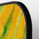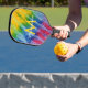 Personalised Custom Printed Monogrammed Pickleball Paddle with red, blue, green and yellow tie dye pattern and casual handwriting script calligraphy font.