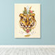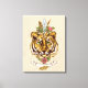 This design features a boho style watercolor portrait of a tiger dressed in flowers and feathers.