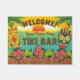 Tiki Bar theme welcome mat with Tiki faces, beach sunset, palm trees, tropical plants, and bamboo fence. Add your name to customise. Fun retro tropical kitsch style for your bar, Tiki lounge, or luau.