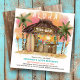 Tiki party birthday invitation features a watercolor Tiki bar on the beach at sunset with palm trees, string lights, Tiki torches and an "Aloha" greeting. Tropical cocktails, a pineapple, hibiscus and palm leaves, a surfboard and a parrot in a pirate hat decorate the bar area. The reverse side is a painting of rustic wood planks that coordinate with the Tiki hut. Perfect for luau and Tiki theme celebrations. Art by KL Stock