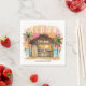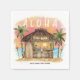Tiki theme baby shower napkins feature a watercolor tiki bar on the beach at sunset with palm trees, string lights, tiki torches a Hawaiian "Aloha" greeting. Tropical cocktails, pineapple, hibiscus and palm leaves, surfboard and a parrot in a pirate hat decorate the bar area. Art by KL Stock