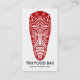 An attractive business card with a bold original hand drawn Tiki Mask style motif Company name and business type on the front with name and other contact details on the back with three Tike mask motifs.