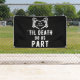 Horizontal wedding banner for indoor or outdoor use with the quote "'Til death do us part" and skeleton hands forming a heart. Black party decorations with an editable date and the bride and groom's initials. Be sure to visit our collection to see more coordinating items that match this design for your special event.