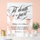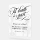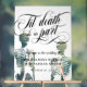 Elegant acrylic Halloween or goth wedding welcome sign with Til death do us part written in a swirly black calligraphy script against a white background with two skeletons. Add your names and wedding date against a white background with transparent skeletons. Skeleton-themed acrylic wedding sign in black and white personalised with names and wedding date.