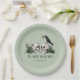 These elegant gothic "Til Death Do Us Part" Irish St. Patrick's Day wedding paper plates feature hand-drawn Irish & gothic themed illustrations in black ink, showcasing husband and wife skulls and a black crow adorned with green roses, leaves, berries, wildflowers and green clovers.