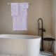 A fractal art design in purple and gold is tiled across this bath towel set. The design has a floral look. The background is lavender. Matching bathroom accessories are available.