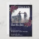 Darkly beautiful save the date card with Till Death Do Us Part saying, dark purplish roses, and a navy blue diamond pattern background. Script typography. Personalise with your own photo.