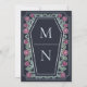 Make a bold statement of eternal love. This gothic wedding invitation features ‘Till Death Do Us Part’ in a coffin-shaped frame, adorned with thorns, roses, and silver accents against deep blue background. Perfect for a hauntingly romantic celebration! Personalise the text, font, and background colour to suit your design preferences. Matching Items in our shop for a complete party theme. Please note that the silver on the invitation is NOT real foil and is printed in flat colours.