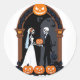 A hauntingly romantic Halloween wedding artwork featuring a skeleton bride and groom holding hands under a gothic arch, surrounded by glowing jack-o’-lanterns and black roses. Perfect for spooky weddings, gothic couples, or Halloween décor.j