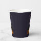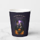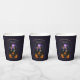 These vintage gothic wedding paper cups feature a sugar skull skeleton couple wearing wedding attire with orange flowers and candles with your names and wedding date to personalize. Image AI generated.