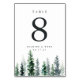 Wintry woodland chic table number cards feature a grouping of watercolor pine trees in hunter green and sage green. Personalise with each table number, with your names and wedding date beneath. Design repeats on reverse side. Coordinates with our Timber Grove wedding invitation suite.