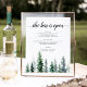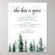 Invite guests to grab a favourite libation from the bar with our charming rustic wedding bar menu sign. 11x14 poster features a bottom border of watercolor pine trees in rich shades of hunter and forest green, with "the bar is open" in off-black calligraphy script and block lettering. Personalise with your wine, beer and spirits selections beneath. Designed to match our Timber Grove collection for autumn or winter weddings in forest or woodland settings.
