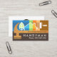 A wooden hammer demarcates an upper landscape scene against a lower brown layer. The landscape at the top depicts a home scene that is being remodeled by a paint brush. The paint stripe from the brush changes all the colours that it goes thru. The scene here can represent some of the services that you might offer e.g. the brush can represent painting, remodeling, the home frame can be for home repairs, the tree for landscaping and the hammer for carpentry. Each depiction is left to your own personal representation. Towards the base in the dark brown layer lies the job title "HANDYMAN" which you can change and the phone contact. Inside the timber hammer you have your business name.
