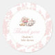 Tea party baby shower sticker design featuring pink floral toile with delicate watercolor teapot and teacup accents. Great for sealing treat bags, envelopes, favors, and party packaging with an elegant finish.