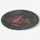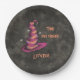 A fun round party paper plate with a floating pink and orange enchanted witch hat that says "Time for Treats, Let's Eat" on a dark charcoal black background. All the text is editable. See all my witch-themed Halloween party supplies. Happy Halloween!