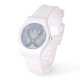 The wrist watch features the art of a silver awareness ribbon angel. The message on the watch notes "TIME 2 HOPE" but it can be customised to change the message to "CURE" or other words. This silver awareness ribbon wrist watches makes for great awareness ribbon jewellery angel gifts! The silver awareness ribbon colour means support for Bell's Palsy, Children with Physical or Learning Disabilities, Disability Rights, Dyslexia, Elderly Abuse, Encephalitis, Parkinson's Disease, Schizophrenia, Brain Disorders and the Disabilities- Includes Traumatic Brain Injuries (TBI), and Stalking Awareness. Let this silver ribbon help bring awareness to these causes!