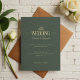 This wedding invitation features a minimalist and elegant design with a Earthy green background and Butter Yellow text. It uses a combination of serif and cursive script fonts to create a sophisticated, balanced layout, with key details like the event name and couple’s names highlighted in larger, ornate text. The overall style exudes timeless luxury and simplicity.